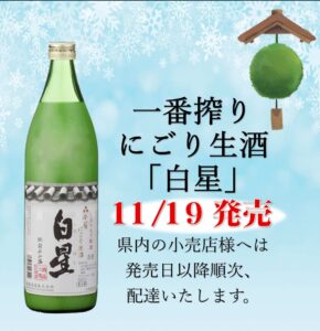 2025年一番搾り「白星」の発売日が決定いたしました!! 2025.11.14 今年の白星について 発売日が11月19日(水)決定いたしました!! 県内の小売店様へは発売日以降、順次配達いたします。 また、地方発送に関しまして、現時点のご注文分は12月上旬の お届け予定となっております。